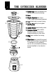 THE OSTERIZER BLENDER 1. Feeder Cap doubles as measuring cup. Lets you add foods while blending. 2. Cover. 3. Blender Containerholds 5 cups (1.25L). Helps user estimate measures. 4. Lug contacts stop to prevent turning. 5. Sealing Ringseals jar and agitator blade assembly. 6. Agitator Bladescreate blending action. 7. Container Bottomholds container assembly together and positions container assembly on motor base. 6. Stop keeps container from turning in base. 9.