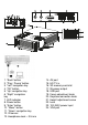 1. “Back” button 2. “Play / Pause” button 3. “Left” navigation key 4. “OK” button 5. “Up” navigation key 6. “Right” navigation key 7. LED indicator 8. Power button 9. “Enter” button 10. “Menu” button 11. “Down” navigation key 12. IR sensor 13. Headphone Jack – 3.5 mm 14. AV port 15. HD TV in 16. SD memory card slot 17. 5V power output 18. USB port 19. Focus adjustment knob 20. Keystone correction knob 21. Height adjustment screw 22. Lens 23. 100-240V power input 24.