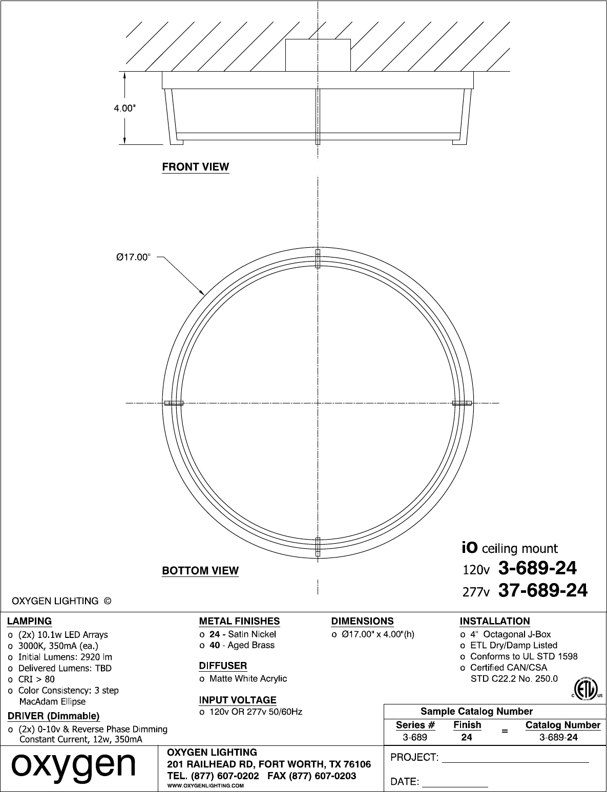 4.00" 217.00" OXYGEN LIGHTING © FRONT VIEW BOTTOM VIEW iO ceiling mount 120v 3-689-24 27wv 37-689-24 LAMING o (2x) 10.1w LED Arrays © 3000K, 350mA (ea.) o Initial Lumen: 2920 Im o Delivered Lumen: TBD o CRI > 80 © Color Consistency: 3 step Macadam Ellipse DRIVER (Dilemma) METAL FINISHES © 24 Satin Nick! © 40 Aged Brass DIFFUSE © Matte White Acrylic INPUT VOLTAGE © 120v OR 277v 50/60Hz o (2x) 0-10v & Reverse Phase Dimming Constant Current, 12w, 350mA DIMENSIONS © ©17.