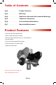 Table of Contents Pg.2 . . . . . . . . . . . . . . . . Product Features Pg.3 . . . . . . . . . . . . . . . . Warranty Pg.4 . . . . . . . . . . . . . . . . Important Information/Precautions/Warnings Pg.5 . . . . . . . . . . . . . . . . Technical Information Pg.6 . . . . . . . . . . . . . . . . Pre-Installation/Installation Pg.7 . . . . . . . . . . . . . . . .