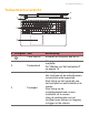 De computer leren kennen - 9 Toetsenbord-overzicht 4 5 1 ? 2 3 # Pictogram Item Beschrijving 1 Schakelt de computer aan en uit. Toets Aan/uit 2 Toetsenbord 3 Touchpad Om gegevens in te voeren in de computer. Zie "Werken met het toetsenbord" op pagina 14. Aanraakgevoelig aanwijsapparaat. Het touchpad en de selectietoetsen vormen één enkel oppervlak. Druk stevig op het oppervlak van het touchpad om een linkerklik uit te voeren.