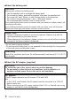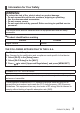 ■ About the battery pack CAUTION Battery pack (Lithium ion battery pack) • Use the specified unit to recharge the battery pack. • Do not use the battery pack with equipment other than the specified unit. • Do not get dirt, sand, liquids, or other foreign matter on the terminals. • Do not touch the plug terminals (+ and −) with metal objects. • Do not disassemble, remodel, heat or throw into fire. If any electrolyte should come into contact with your hands or clothes, wash it off thoroughly with water.