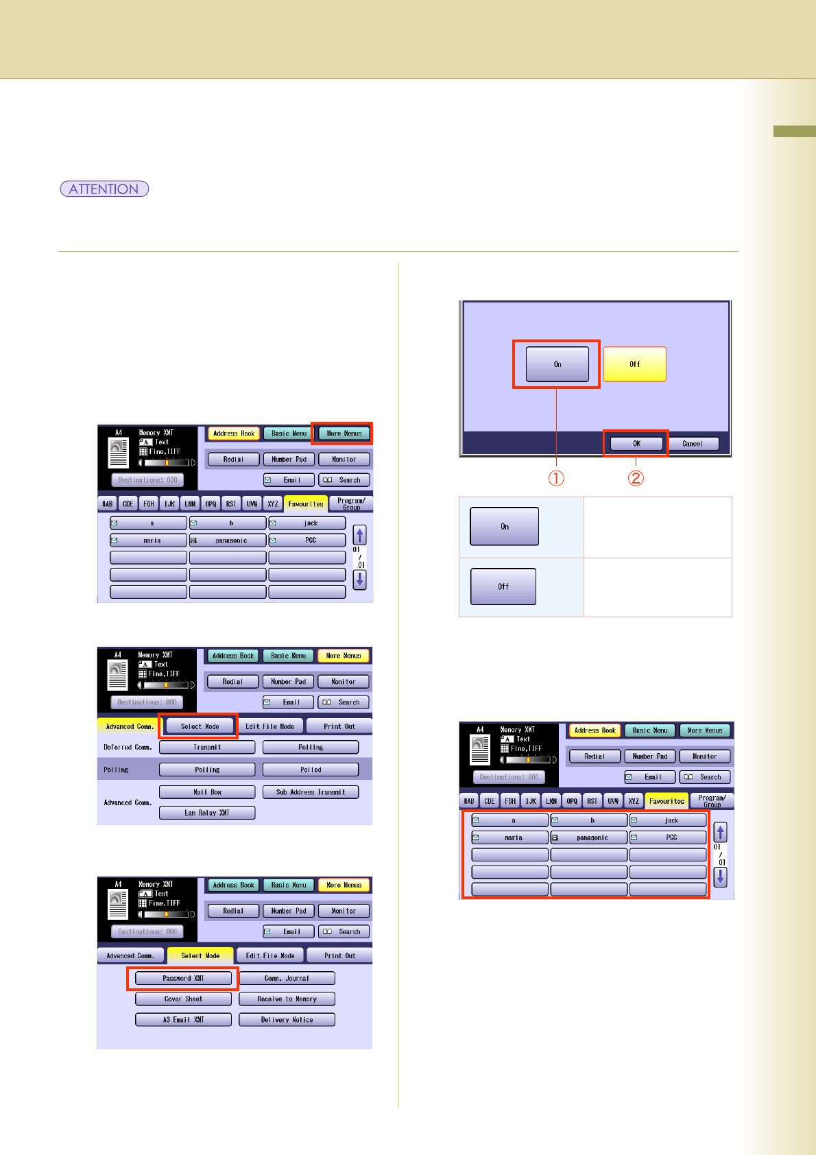 z You must set the password (4-digit) in the Function Parameter “43 Password-Transmit” (Fax/Email Settings >