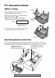 For best performance Battery charge Handset Place the handset on the cradle of the base unit for about 4 hours before initial use. Slowly place the handset on the cradle vertically ( 1 ), then lean it back ( 2 ). ● A beep will sound, and the following will be displayed for an instant time on the base unit. Display: CHARGING 1 2 Charge contacts The display will show the date and time. ● If the base unit is in use, a beep may not sound and the above display may not be shown.