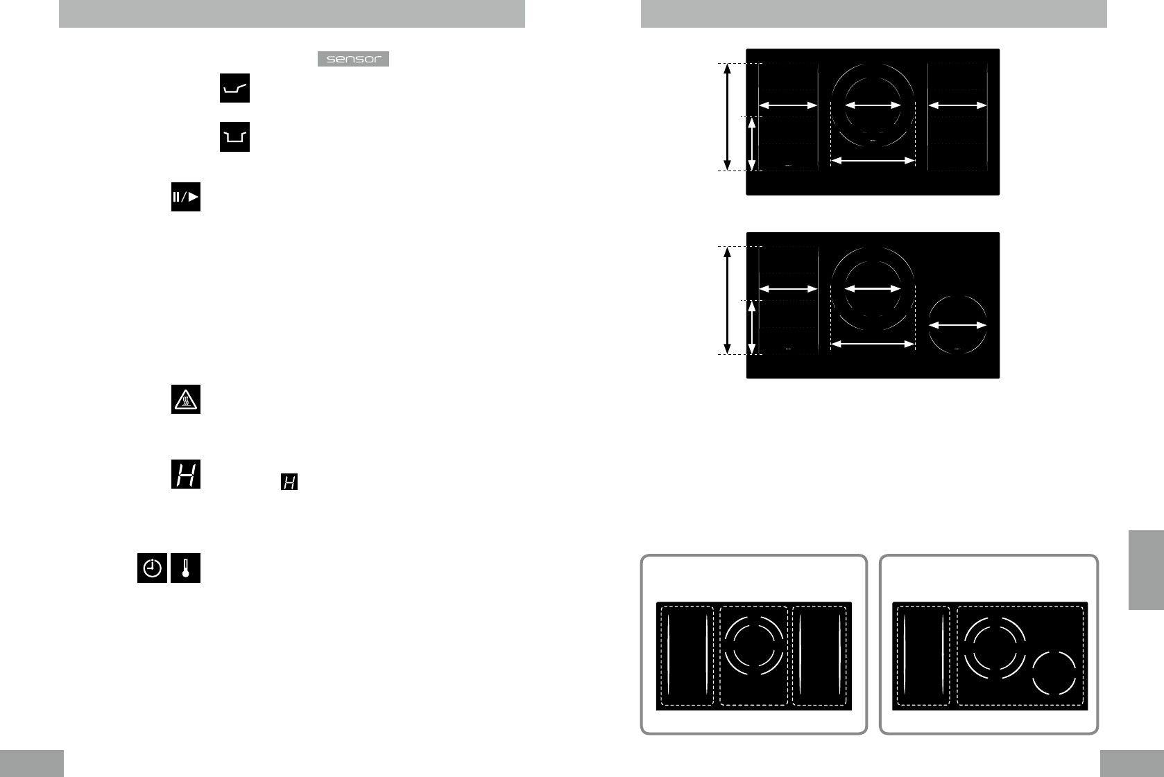 Die Kochzonen sind in zwei oder drei Gruppen zusammengefasst, d. h. die