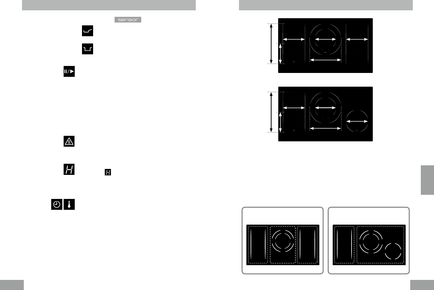 The cooking zones are grouped into two or three, i.e. front and rear on the left and