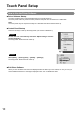 Touch Panel Setup ■ Touch panel sensitivity and coarse sensitivity settings Response rate of the sensor can be selected with “Coarse sensitivity”. The thicker the glass thickness is set, the slower the sensor response speed is. Settings: Option 1 (1 - 3 mm), Option 2 (3 - 6 mm), Option 3 (6 - 12 mm), Option 4 (12 mm or more) Touch panel sensitivity can be changed under “Threshold”. Setting the value smaller makes the sensitivity higher. Setting the value bigger makes the sensitivity lower.