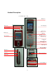 Handset Description * For detail usage of key Earpiece Ant enna LCD display Ear- m icrophone Menu key N Side keys OK key N Navigat ion keys Sub display Cam era key Clear key N Alphanum eric keys Microphone Power Adapt or Connect ors Ant enna Cam era Ear- m icrophone Side key s Pow er Adapt or Connect ors 8