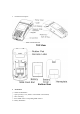 1. Production Description: TOP View Bottom View 2. Installation 1) SAM Card Installation ① Open up battery cover, which is at the bottom of the terminal; ② Take out battery; ③ Insert SAM card to corresponding SAM card slot.