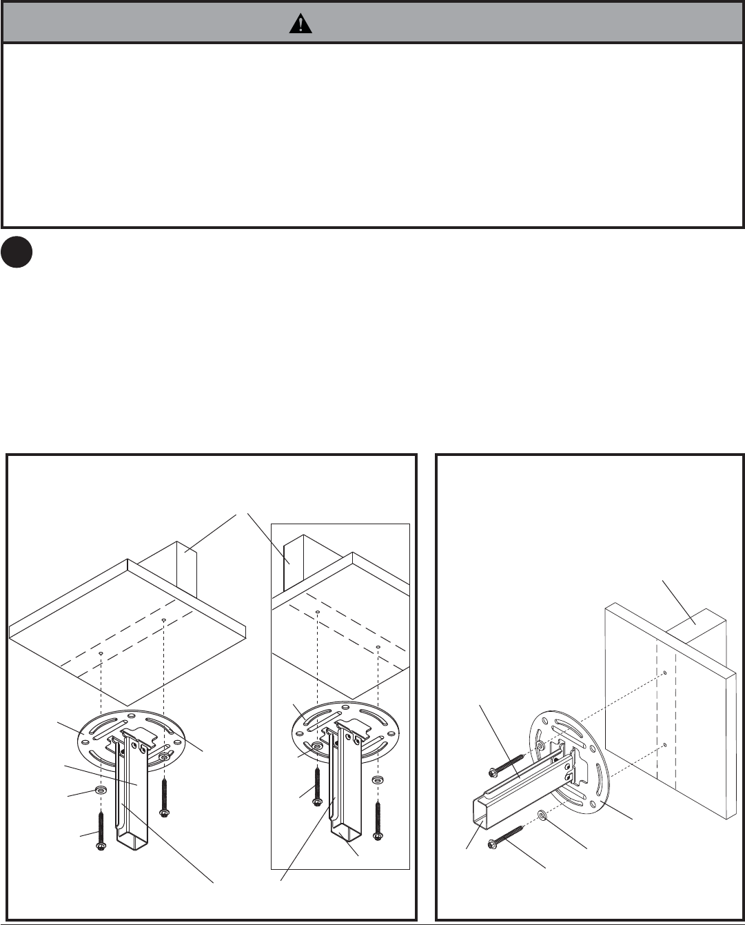 • Tighten wood screws so that ceiling/wall plate is fi rmly attached, but do not overtighten. Overtightening can damage
