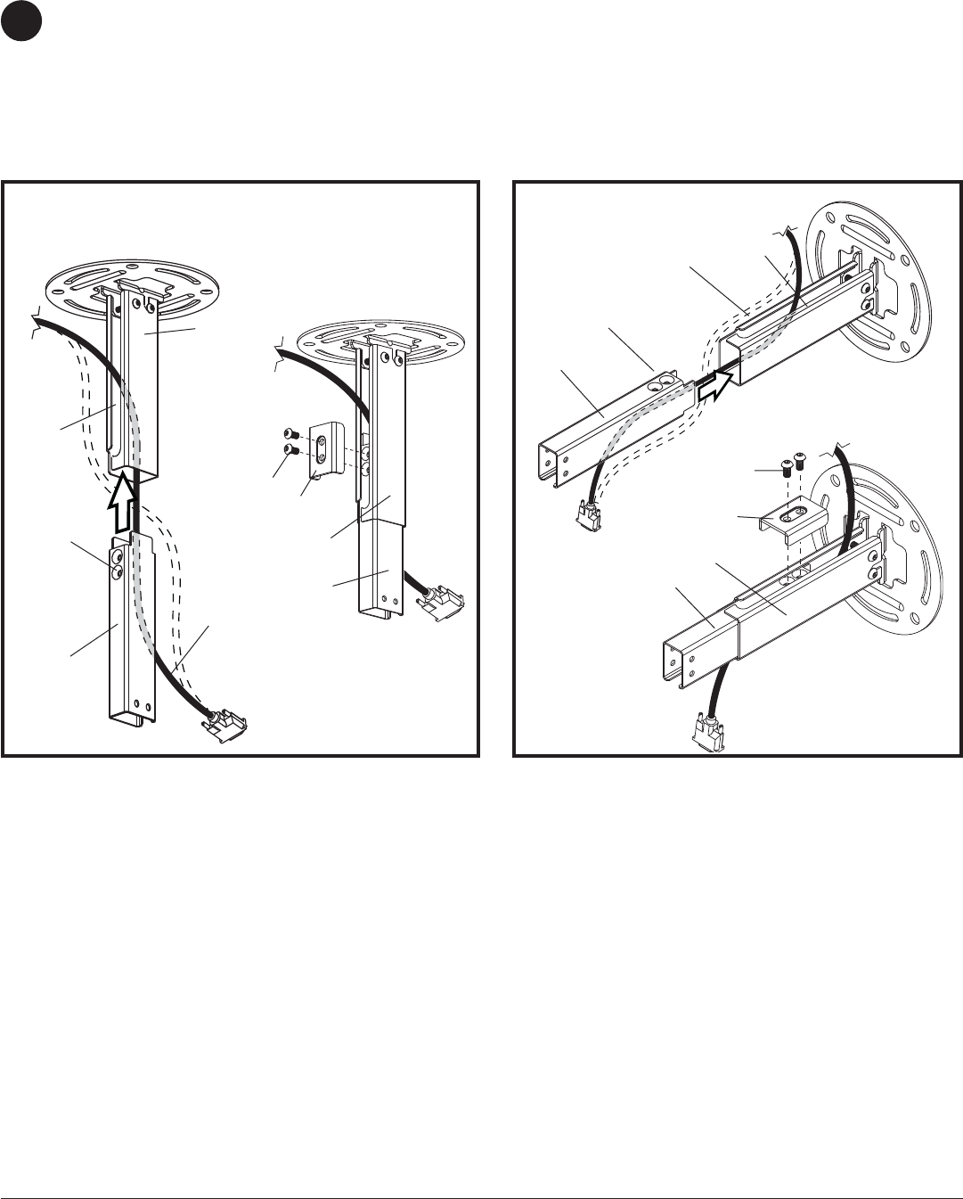 Guide projector cables into openings in channels then insert inner channel (C) into outer channel (B) as shown in