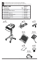 ENG Parts (Before beginning, make sure you have all parts shown below) ESP Piezas (antes de iniciar, asegúrese de tener todas las piezas siguientes) FRN Pièces (avant de commencer, assurez-vous d’avoir toutes les pièces illustrées ci-dessous) Parts List HCC101 Qty Part # Description A B C D E F G H main assembly HCACC507 adapter bracket security lock HCACC507 laptop tray HCACC507 USB powered fan HCACC507 square pad HCACC507 screw knob scanner bracket 1 1 1 1 1 2 4 1 009-S7610 009-1638 565-0066 ACC329
