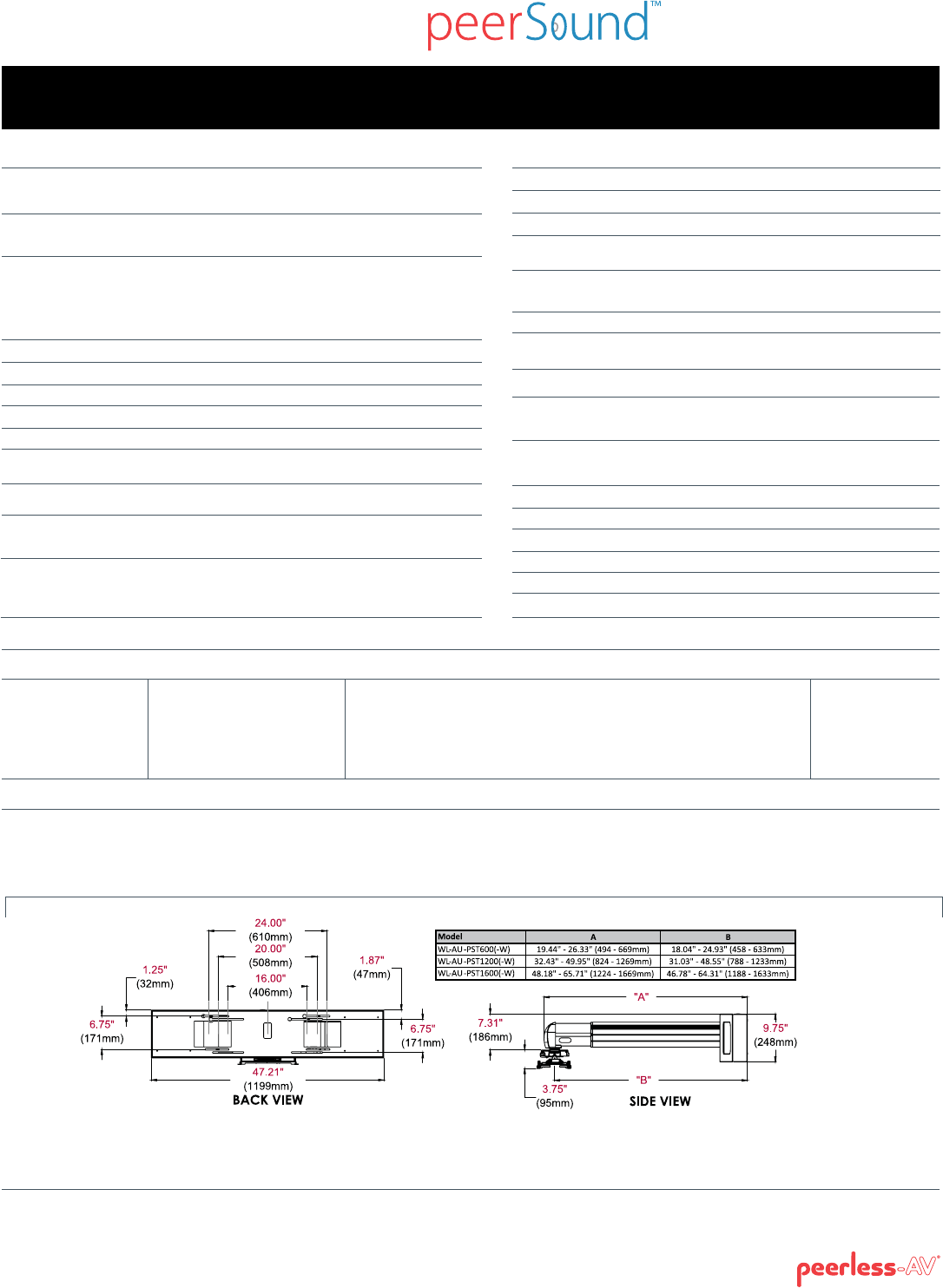 Dimensions (W x H x D) WL-AU-PST600(-W) 47.21" x 11.06" x 19.44"-26.33"