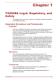 Table of Contents Chapter 1 TOSHIBA Legal, Regulatory, and Safety Copyright, Disclaimer and Trademarks .............................................. 1-1 Regulatory Information ......................................................................... 1-2 Video Standard Notice .......................................................................... 1-8 OpenSSL Toolkit License Issues ......................................................... 1-8 FreeType License Issues ......................................