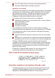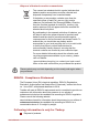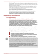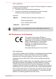 FCC conditions This device complies with part 15 of the FCC Rules. Operation is subject to the following two conditions: 1. 2. This device may not cause harmful interference. This device must accept any interference received, including interference that may cause undesired operation. Contact Address: TOSHIBA America Information Systems, Inc. 9740 Irvine Boulevard Irvine, California 92618-1697 Telephone: (949) 583-3000 This information is only applicable for the countries/regions where it is required.