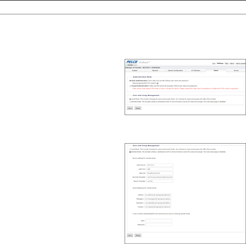Set up user authentication mode and local/remote information.