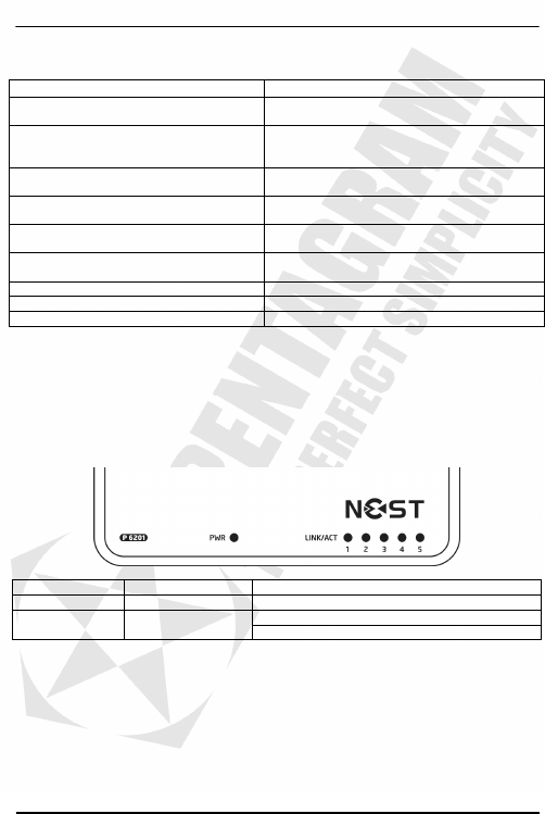 Jedna PWR dioda signalizuje napájení přístroje a 5 diod (LINK/ACT) indikuje práci jednotlivých
