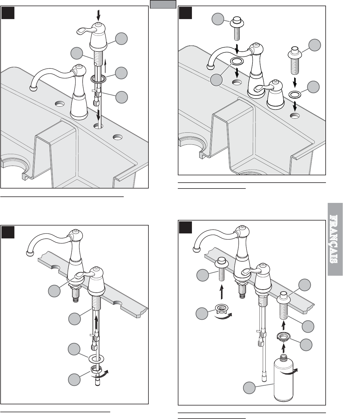 Depuis le dessous de l’évier, fixer le guide de flexible (10A) et la tige de distributeur de savon