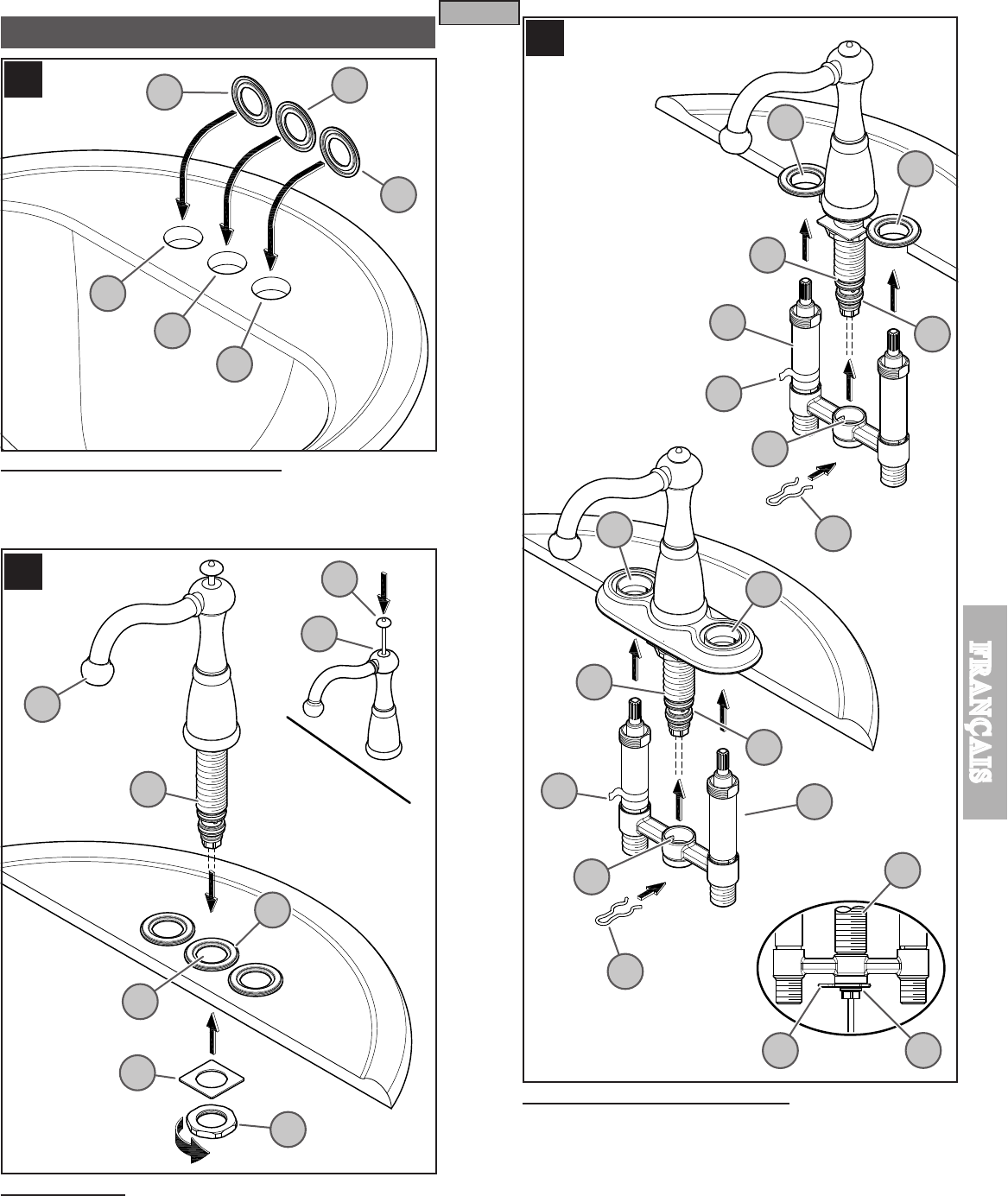 Introduire la tige (7C) du bec dans le joint du bec (7D) sur le trou central (7E) de l’évier.