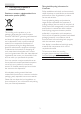 1. Pomembno Taking back/Recycling Information for Customers 1.3 Odstranjevanje izdelka in materiala embalaže Philips establishes technically and economically viable objectives to optimize the environmental performance of the organization's product, service and activities. Direktiva o ravnanju z odpadno električno in elektronsko opremo (WEEE) From the planning, design and production stages, Philips emphasizes the important of making products that can easily be recycled.