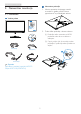 2. Namestitev monitorja Namestitev podnožja 2. Namestitev monitorja 1. Monitor postavite obrnjenega navzdol na mehko in gladko površino, da ne popraskate in ne poškodujete zaslona. 2.1 Namestitev Vsebina paketa 238G4 2. Trdno držite podnožje z obema rokama. (1) Podnožje nežno namestite na VESA podstavek, tako da se to zaklene z zaklepom. (2) S prsti privijte vijak, ki se nahaja na dnu podnožja, in podnožje trdno pritrdite na stojalo.