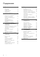 Съдържание 1 2 3 Важно Безопасност Поддръжка Правни бележки Устойчивост Помощ и поддръжка 3 5 6 9 11 Използване на телевизора 12 Контроли на телевизора Гледане на телевизия Преглед на справочника за програми Възпроизвеждане на мултимедийни файлове Smart TV Интерактивна телевизия 12 14 Допълнителни функции на телевизора Спиране на телевизора на пауза Записване на телевизионни предавания Използване на Skype™ Игри Преглед на телетекст Задаване на ключалки и таймери 4 Промяна на настройките на телеви