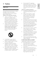 Sigurnost Mjere opreza Prije nego počnete koristiti televizor, paţljivo pročitajte sve upute. Ako se zbog nepridrţavanja uputa uzrokuje oštećenje, jamstvo neće biti valjano. Opasnost od strujnog udara ili poţara! Televizor ne izlaţite kiši ni vodi. Blizu televizora ne stavljajte posude s tekućinom, na primjer vaze. Ako se tekućina prolije po televizoru, smjesta ga isključite iz naponske utičnice. Od Philipsove sluţbe za korisnike zatraţite da prije korištenja provjeri televizor.