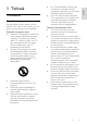 Turvallisuus Turvallisuusohjeet Perehdy kaikkiin ohjeisiin ennen kuin alat käyttää TV:tä. Takuu ei ole voimassa, jos vika johtuu siitä, että ohjeita ei ole noudatettu. Sähköiskun tai tulipalon vaara! Ä lä altista TV:tä sateelle tai vedelle. Ä lä aseta nestettä sisältäviä astioita kuten maljakoita TV:n lähelle. Jos nesteitä kaatuu TV:n päälle tai sisään, irrota TV heti verkkopistorasiasta. Ota yhteys Philipsin asiakastukeen, jotta TV tarkastetaan ennen käyttöä.
