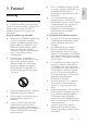 Biztonság Ó vintézkedések A TV-készülék használata előtt figyelmesen olvassa el az összes utasítást. A garancia nem terjed ki azokra a hibákra, amelyek az utasítások figyelmen kívül hagyása miatt keletkeztek. Áramütés veszélye vagy tűzveszély! Soha ne érje a készüléket csapadék vagy víz. Soha ne helyezzen a készülék közelébe folyadékot tartalmazó edényt, például vázát. Ha a készülékre vagy a készülékbe folyadék kerülne, azonnal húzza ki az elektromos hálózati csatlakozót.