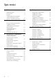 Spis treści 1 2 3 Ważne 3 Bezpieczeństwo Konserwacja Prawne Podporządkowanie zasadom zrównoważonego rozwoju Pomoc i wsparcie techniczne 3 4 5 9 10 Korzystanie z telewizora 11 Przyciski sterujące telewizora Oglądanie telewizji Wyświetlanie przewodnika telewizyjnego Odtwarzanie plików multimedialnych Smart TV Telewizor interaktywny 11 13 Korzystanie z dodatkowych funkcji telewizora Wstrzymywanie obrazu telewizyjnego Nagrywanie programów telewizyjnych Korzystanie z programu Skype™ Granie w gry Wyświ