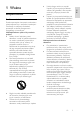 Warunki gwarancji Niebezpieczeństwo obrażeń ciała, uszkodzenia telewizora lub utraty gwarancji! Nie wolno samodzielnie naprawiać telewizora. Telewizor i akcesoria należy używać zgodnie z przeznaczeniem określonym przez producenta. Znak ostrzegawczy wydrukowany z tyłu telewizora wskazuje na niebezpieczeństwo porażenia prądem elektrycznym. Nie wolno zdejmować pokrywy telewizora. W sprawach dotyczących serwisu lub napraw zawsze należy kontaktować się z działem obsługi klienta firmy Philips.