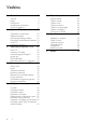 Vsebina 1 2 3 4 5 Pomembno 3 Varnost Nega Pravni pouk Vzdrţnostna proizvodnja Pomoč in podpora 3 4 5 7 9 Uporaba TV-sprejemnika 10 Tipke/lučke na televizorju Gledanje televizije Prikaz programskega vodnika Predvajanje večpredstavnih datotek Smart TV Interaktivna televizija 10 12 16 18 21 24 Naprednejša uporaba TV-ja 25 Pause TV Snemanje TV-oddaj Uporaba programa Skype™ igranje iger, Prikaz teleteksta Nastavitev ključavnic in časovnikov 25 26 29 32 33 34 Spremenite nastavitve TV-ja 36 Slik