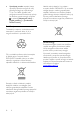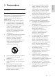 Slovenščina Brezţično omreţje je popačeno ali ga ni bilo mogoče najti: Poskrbite, da brezţičnega omreţja ne bodo ovirale mikrovalovne pečice, telefoni DECT ali druge sorodne naprave Wi-Fi. Če brezţično omreţje ne deluje, poskusite uporabiti ţično omreţno povezavo. Preverite, ali poţarni zidovi v omreţju dovolijo dostop do brezţične povezave TV-ja. Obrnite se na Philips Opozorilo: televizorja ne poskušajte popraviti sami.
