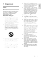 Safety Precautions Read and understand all instructions before you use your TV. If damage is caused by failure to follow the instructions, the warranty does not apply. Risk of electric shock or fire! Never expose the TV to rain or water. Never place liquid containers, such as vases, near the TV. If liquids are spilled on or into the TV, disconnect the TV from the power outlet immediately. Contact Philips Consumer Care to have the TV checked before use.