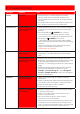 Category Problem Tip Picture Power is on but screen image is off. • Check “Picture Off” mode was not activated by pressing the “OK” button on your remote. • Check if the connection for your source device is properly secured. • Check if the correct input is selected by pressing w (INPUT) on your remote. • Verify that your HDMI mode for the input selected matches the resolution output of your source device.