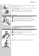ENGLISH 13 Cleaning the trimmer with the cleaning brush (AT941/AT940/AT918/AT897/AT896/AT894/AT891/ AT890/AT889/AT887/AT886/AT872/AT811/AT797/ AT796/AT790/AT756 only) Clean the trimmer every time you have used it. 1 Switch off the shaver. 2 Push the trimmer slide downwards to open the trimmer. 3 Clean the trimmer with the short-bristled side of the cleaning brush. Brush up and down along the trimmer teeth. 4 Close the trimmer (‘click’).