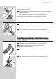 BAHASA MELAYU Mengecas di dalam dirian pengecasan (AT941/AT940 sahaja) 1 Letak plag kecil di dalam dirian pengecasan. 2 Letakkan penyesuai di dalam soket dinding. 3 Letakkan alat pencukur di dalam penegak cas. ,, Lampu pengecasan menunjukkan status pengecasan pencukur (lihat bahagian ‘Penunjuk cas’ dalam bab ini).