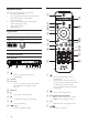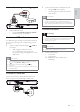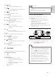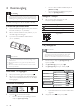 5 Spela upp 1 Spela upp en skiva 2 Var försiktig 3 Anslut en USB-enhet till uttaget (USB) på produkten. Tryck på , välj [Bläddra i USB] och tryck sedan på OK. » En innehållsmeny visas. Välj en fil som du vill spela upp och tryck på OK. » Uppspelningen startar (i Spela upp video, Spela upp foton och Spela upp musik finns mer information). • Om du vill stoppa uppspelningen trycker du på eller tar bort USB-enheten. • Placera inte andra föremål än skivor i skivfacket.