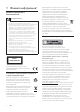 1 Важная информация! Важные сведения о безопасности Предупреждение • Риск перегрева! Никогда не устанавливайте • • • • • • устройство в ограниченном пространстве. Оставляйте не менее 10 см свободного пространства вокруг устройства для обеспечения вентиляции. Убедитесь, что занавески или другие объекты не закрывают вентиляционные отверстия устройства.