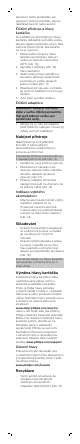 Varování - - - - - - - Pokud dojde k poškození či rozbití přístroje, hlavice kartáčku nebo adaptéru, nepoužívejte je, aby nedošlo ke zranění. Pokud dojde k poškození adaptéru, musíte jej vždy nahradit adaptérem původního typu, abyste předešli možnému nebezpečí. Adaptér obsahuje transformátor. Adaptér nikdy nenahrazujte jinou zástrčkou. Mohlo by tak dojít k nebezpečné situaci. Přístroj plně nabijte nejméně každé 3 měsíce, aby se zachovala životnost baterie.