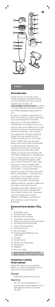 - - - - - - If the adapter is damaged, always have it replaced with one of the original type in order to avoid a hazard. The adapter contains a transformer. Do not cut off the adapter to replace it with another plug, as this causes a hazardous situation. Fully charge the appliance at least every 3 months to sustain battery lifetime. Do not insert metal-containing material into the socket for the appliance plug to avoid short circuiting.