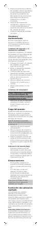 El aparato no funciona. Asegúrese de que el aparato está desconectado de la red cuando lo use. Cargue el aparato según las instrucciones de este manual de usuario. Compruebe si hubiese algún fallo en el suministro de energía y que la toma de corriente está activa. Asegúrese de que ha pulsado correctamente el botón de encendido/apa gado. Cuando lo conecte a la red, compruebe si el piloto de carga se ilumina para asegurarse de que el aparato carga.