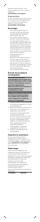 L’appareil ne fonctionne pas. Assurez-vous que l’appareil est éteint et débranché lorsque vous l’utilisez. Rechargez l’appareil selon les instructions de ce mode d’emploi. Vérifiez qu’il ne s’est pas produit de panne de courant et que la prise secteur est alimentée. Assurez-vous d’avoir correctement appuyé sur le bouton marche/arrêt. Lorsque l’appareil est branché sur le secteur, vérifiez si le voyant de charge de l’appareil s’allume pour vous assurer que l’appareil est en cours de charge.