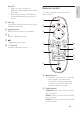 Remote control This section includes an overview of the remote control. a b NFC tag Tap the NFC-enabled device on the tag for Bluetooth connection. b (Standby-On) Switch the main unit on or to standby. c c d e English Blue LED • Lights up when you switch to Bluetooth mode and Bluetooth devices are paired. • Blinks when you switch to Bluetooth mode and Bluetooth devices are not paired. Switch to Bluetooth mode. Toggle through all sources. f +/- (Volume) Increase or decrease volume.