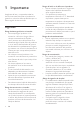 Contenido 1 Importante 2 2 3 3 3 4 2 Producto 4 4 5 6 7 7 3 Conexión y configuración 8 8 8 Unidad principal Mando a distancia Altavoces inalámbricos Subwoofer inalámbrico Conectores Conexión a la unidad principal Carga de los altavoces Emparejamiento con los altavoces o el subwoofer Colocación de los altavoces Conexión al televisor Conexión de dispositivos digitales a través de HDMI Conexión del audio del televisor y de otros dispositivos 4 Uso del producto Ajuste del volumen Elección del sonido re