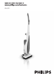 한국어 소개 필립스 제품을 구입해 주셔서 감사합니다! 필립스가 드리는 지원 혜택을 받으실 수 있도 록 www.philips.co.kr에서 제품을 등록하십시오. 각 부의 명칭 (그림 1) A B C D E F G H I J K L M N O P Q R S T U V W 전원 스위치 스틱 상단 부분 스틱 상단을 축소하는 버튼 스틱 하단 부분 바닥 노즐 고정장치 나사 고정장치 롤러 브러시 앞바퀴 커팅 그루브 집전판 충전대 집전판 충전 표시등 충전대 후면 지지대 어댑터 천 필터 먼지통 원뿔형 필터 먼지통 분리 버튼 먼지통 열림 버튼 바닥 노즐 분리 버튼 뒷바퀴 주의 사항 본 제품을 사용하기 전에 이 사용 설명서를 주의 깊게 읽고 나중에 참조할 수 있도록 잘 보관하십시오. 위험 -- 물, 다른 용액 또는 가연성 물질은 절대 흡입하지 마십시오. 타고 남은 재는 완전히 꺼져서 식기 전까지는 절대 흡입하지 마십시오. -- 본체 또는 충전대를 물이나 기타 용액에 담그거나 수돗물로 헹구지 마십시오.