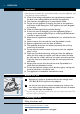 ENGLISH 9 After the Calc-Clean process - Put the plug in the wall socket and let the iron heat up to allow the soleplate to dry. - Unplug the iron when the temperature light has gone out. - Move the hot iron gently over a piece of used cloth to remove any water stains that may have formed on the soleplate. - Let the iron cool down before you store it. Storage 1 Make sure the appliance is unplugged and set the steam control to position 0. C 2 Empty the water tank. C 3 Let the iron cool down.