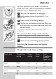 English 11 4 Set the appropriate steam setting (see the ‘Temperature and steam settings’ table above). Note: Make sure that the steam setting you select is suitable for the set ironing temperature. 5 Put the mains plug in an earthed wall socket. ,, The amber temperature light goes on. 6 When the amber temperature light has gone out, wait a while before you start ironing. ,, The temperature light goes on from time to time during ironing.