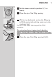 English 17 7 Hold the iron over the sink, press and hold the Calc-Clean button and gently shake the iron to and fro. ,, Steam and boiling water come out of the soleplate. Impurities and flakes (if any) are flushed out. 8 Release the Calc-Clean button as soon as all the water in the tank has been used up. 9 Repeat the Calc-Clean process if the iron still contains a lot of impurities. After the Calc-Clean process 1 Put the plug back into the wall socket and let the iron heat up to let the soleplate dry.