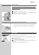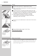 ENGLISH Storage 1 Switch off the appliance and unplug it. 2 Remove the water tank and empty it. 3 Put the iron on the iron platform. Push the carry lock to lock the iron onto the platform. 4 Fold the supply hose and mains cord. Put them in their respective storage compartments. 5 You can carry the appliance with one hand by the handle of the iron. Do not carry the appliance by holding the water tank release lever.